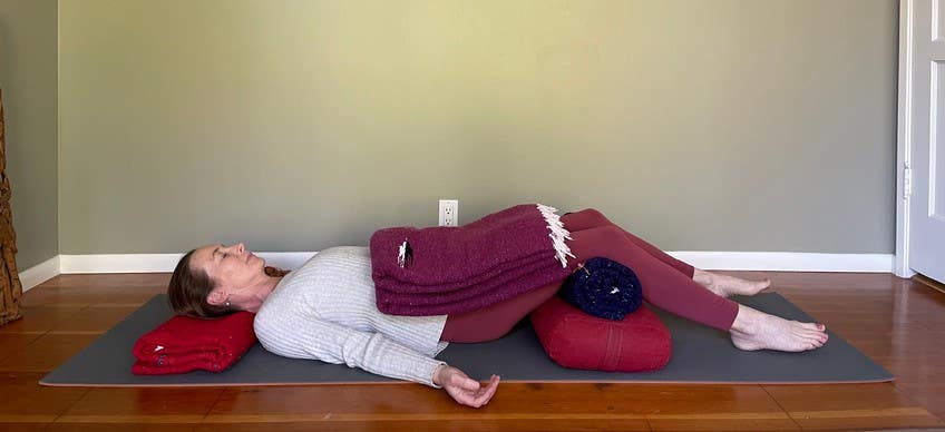 For a practice of conscious relaxation, if possible, lie down. You can also sit in a chair or sofa, but it is easier to activate the relaxation response when lying down. It is important to make yourself as comfortable as you can. I like to place a pillow under my head and neck and several blankets or pillows under my knees. In times when I feel restless and perhaps anxious as well, I place several folded blankets or pillows across my thighs and abdomen. The weight of that support helps me settle; it is like giving myself a warm hug. Take time to settle into the position, feeling the body from toes to head, back of the body and front of the body, cultivating a felt sense of your whole body. It is helpful to give your mind an object of focus, either sensing the breath, counting each exhale from twenty to zero, or listening to sounds arising and fading away. Listening to calming music or a guided audio meditation can also be very helpful.