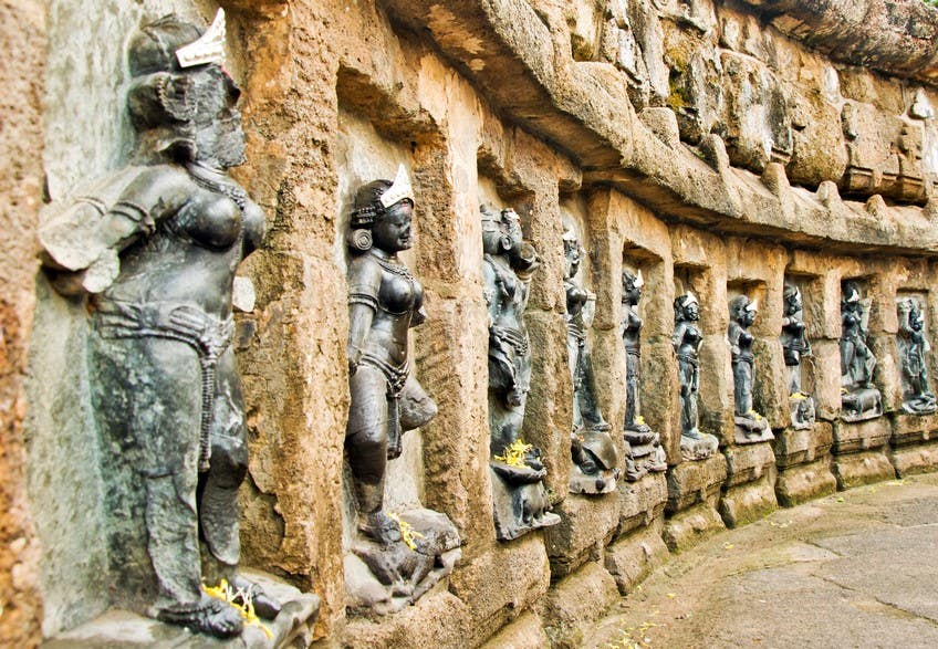 There is a distinctive symbolism to the design of the Yogini temples, as they are constructed in a circle or rectangular form, open to the sky. Their layout is a stark contrast to the standard temple form, which encases the Goddess within the garbha griha, or spiritual heart of the structure. The Yoginis circle is symbolic of the great Chakra wheel of existence. They are seated in a circle surrounding us as guardian energies, not Goddesses, as our guides, ushering us towards deepened divine states.