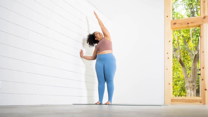 As you continue to open heart to the sky, wrap your outer arm down toward your face, like you're trying to hide your armpit. And then press down in house. Stand yourself back up. Lower your right arm down by your side. Bring your left hand to about the height of your shoulder, and step out until your arm is straight.