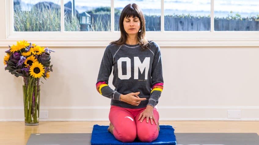 Bring your hands together in front of your heart, if you'd like. And we'll close with three sounds of Om. Let's continue to feel the inhalation dropping in and down to the pelvic floor, and then the sound of Om coming up through the central channel, the sound nourishing, touching, soothing each energy center along the central channel. Exhale the breath out. Inhale down into the pelvic floor.