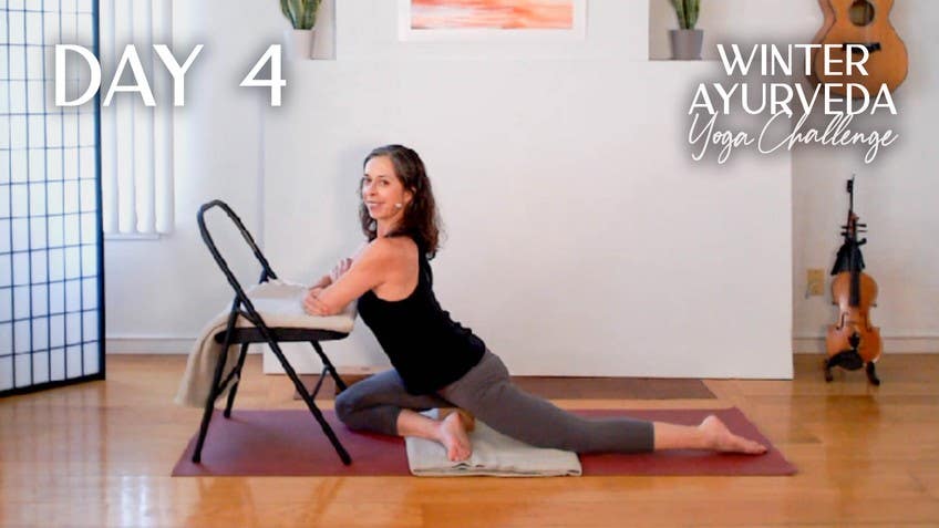 Hello, everyone. Welcome to day four of the Ayurveda Winter Challenge. I'm so glad you're here to join me today. We're going to do a yin restorative chair practice to dip into some of the more meditative aspects of the practice. And hopefully you've enjoyed doing our sun salutation and dynamic work through day one and three. And we'll get back to that again tomorrow. Today we're going to be on our bellies for a little bit. So I want to encourage maybe some blanket or cushion to make sure your pelvis is comfortable. And we will use a chair for most of the poses today. And we'll go from some backbends and forward bends today, a little bit of twist, hopefully something new for all of you, even the seasoned yin yogis out there. Maybe we'll get a new pose here today. I've added a blanket over my chair just so it's a little bit softer and not cold and shocking if you have a metal chair that you're using, but any chair will do. And when you have a chair ready to go and a blanket for maybe underneath your pelvis, we're going to begin actually in the prone position on your belly. Slide the padding underneath my pelvis and I've got my phone here to keep track of time so you can totally relax knowing time is being taken care of. As we head into postures that might be four to five minutes in general. So as we come down to the floor might stack your hands on top of each other and then let your forehead rest on your stacked hands. I like to generally begin with a little bit of wagging my hips side to side just doing a little bit rocking in the spine to let go of any gripping or tension that might live there. And really just this opportunity to loosen up before we move towards stillness. So maybe I wiggle out a little bit of the restlessness and eventually things start to slow down. The movement starts to slow down and perhaps we stay with the forehead down on your stacked hands and that eyes might be open or eyes might be closed as you start to feel the support of the ground underneath you. And welcome the heaviness of the bones, the flesh, the muscles, welcome that heaviness to root you here in your body. And I want to encourage as we start each pose to try to pay attention to 10 breaths as we transition from whatever responsibilities we've been in charge of today or separating from your householder life to come into this practice time, the ritual of the practice. And it won't count every time to 10 but for your own practice finding your own rhythm of maybe counting to 10. Inhale, exhale, one. Inhale, exhale, two. And gradually working towards 10 is to feel more presence as we move into the adventure of this particular pose. Curious about what awaits us as we get deeper into our breath count. As we move into the more spacious regions, potentially arrive at that place where there'll be some silence. And maybe in that silence a little bit of peace, a little bit of ease. And as we go deeper into that 10 count with our breath, just notice if you can sense more muscles beginning to soften, the body beginning to widen. As if we're softening the boundaries and edges of our shape so that we get even more spacious, more connected to the ground as our water body softens. And in that softening, receiving the support, are there certain parts that are reluctant to receive support? Just take note. If you notice some of those areas that feel a little bit tight or grip, just spend a little more attention in that area.