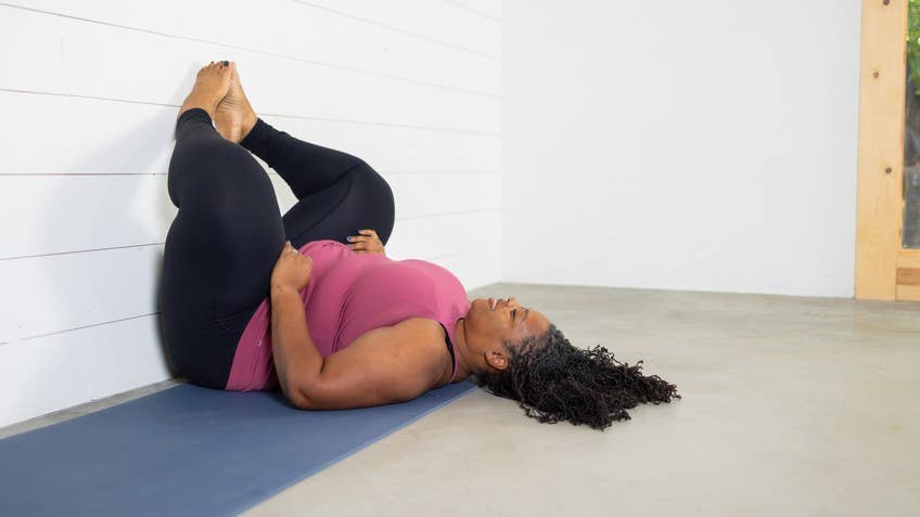 You want for your feet to slide down the wall. And allow for both legs to nestle onto one another. This is also an opportunity if you moved away from the wall to get a little bit closer. There's a really nice tucking sensation that happens when you're really close to the wall, and you're also welcome to stay where you are. Notice too if it feels good or right to have a blanket or, blocks underneath or between your legs.