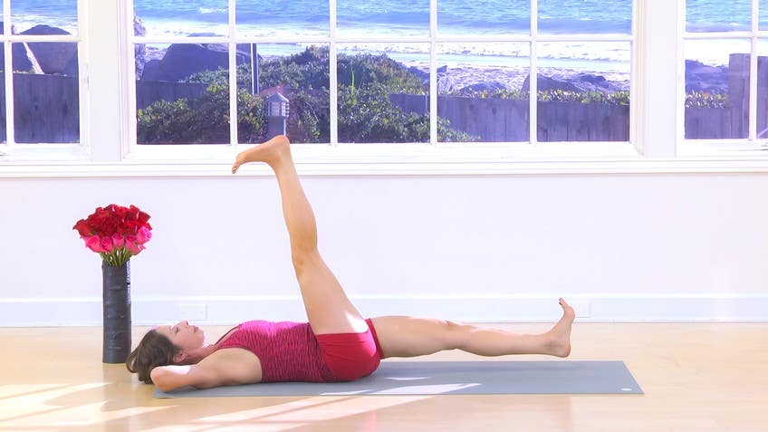 Leg straight up into the air, and try to keep your hips squared in this position. As you exhale, we'll take your left knee over to the right elbow on exhale. Inhale, take the leg back up. And the exhale again, take your left knee to your right elbow on exhale. Inhale, reach up.