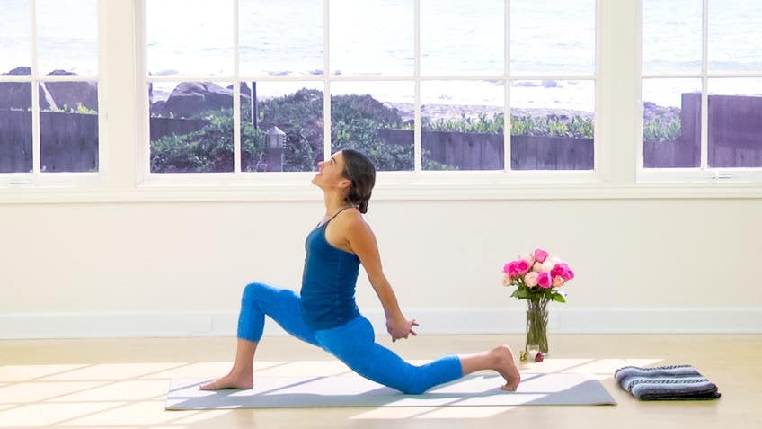 As you are ready, make your way forward, inhale, half arch, exhale, forward fold, Uttanasana and bend the knees, Uttasana chair, inhale, reach the arms up, exhale, press down through the feet, hands together and take a moment to pause here and spreading the toes and from here moving towards our second round of Surya Namaskar B. So that'll be our base as we move into some deeper lunges. As you're ready, hands at the heart, bend the knees, inhale, Uttasana, exhale, dive forward and in, inhale, half arch, exhale, bend the knees, step the right foot back, step the left foot back, lower onto the knees, inhale to Cobra, exhale, press back, downward facing dog, inhale the right leg high, this time as you exhale, float the right foot between the hands and let the left knee lower down and you might tuck a blanket under the knee for support and stay low here, the hands might rest on that front thigh, from here you might inhale, circle the arms up towards crescent moon, inhale, exhale, release and then interlacing the fingers and gently begin to let the heart lift and you might lean back, breathing and then as you're ready, release, tuck the back toes, lift the back leg, step back into plank, lower onto the belly, again inhale to Cobra, exhale, press back, downward facing dog and take a breath here. As you're ready, second side, inhale the left leg high, exhale, float the left foot between the hands, let the right knee lower down, coming into that low lunge, as you're inspired reach the arms up towards the shape of crescent moon, breathing, nice, releasing the arms you might interlace the fingers, getting a nice shoulder opening here, lifting the heart, gonna softening through the jaw, good, as you're ready, releasing the arms, lifting the back knees, stepping back into plank, nice strong core, lower onto the knees, inhale to Cobra, exhale, release, tuck the toes, knees, press back, downward facing dog, about three to five breaths, inhale, exhale, inhale, exhale, inhale, exhale, inhale, exhale, inhale, exhale, exhale, and then as you're ready find your way forward towards Uttanasana, inhale half arch, exhale, forward fold, bend the knees, Uttasana chair, inhale, reach the arms up, exhale, press down through the feet, hands together, take a moment to pause, you might notice the sensation through the body, the heart, the breath, notice the quality of your attention, and together we'll find one more round, and as you're ready, bend the knees, inhale, reach the arms up, exhale, dive forward and in, inhale half arch, exhale, bend the knees, step your right foot back, your left foot back, plank, lower down, inhale to Cobra, lifting the heart, exhale, release, downward facing dog, inhale the right leg high, exhale, float the right foot between the hands, and we'll come down into that low lunge, softening the jaw, as you come up reach the arms up, we're going to soften, bend that left elbow, bring the right hand onto the left elbow, and then as you begin to let the heart lift, taking it up out and over gently to the right, so sinking down into the hips, breathing, good, and then releasing that right hand towards the floor, reaching that left arm across the body towards that right knee, feeling that nice stretch through the left side of the body, breathing, good, as you're ready, release, hands around the foot, tuck the back toes, step back into your plank, nice strong legs as you lower down to Cobra, lifting the heart, elbows in, exhale, release, downward facing dog, as you're ready lift the left leg high, exhale, float the left foot between the hands, letting the right knee lower down into the lunge, again softening the jaw, inhale, reach the arms up, this time bending the right elbow, left hand on that right elbow, and then reaching it up out and over towards the left, just allowing the right side of the body to lengthen as you breathe, and finding a place where the head and neck feel comfortable and connected, sinking down into that left hip, and then eventually you might release that left arm towards the floor and reach the right arm up, out, over, breathing, feeling a nice wonderful opening in that right hip, good, as you're ready, release, and then tuck the back toes, find your plank, strong legs as you lower down, inhale to Cobra, and exhale, release, tuck the toes under, this time we'll find our way into child's pose, drawing the hips back, forehead towards the floor, reaching the arms out in front of you and then actively pressing the floor away from you as you deepen the tuck, the fold through the hip crease, breathing into the back of the heart, shoulder blades, you might release the hands around the heels, and taking a moment to rest here, and as you're ready, sliding your palms underneath you, chin into the chest, and slowly rolling up, and then let's find our way onto all fours and we'll take some Cat-Cow, spreading the fingers wide, breathing in, and as you exhale, curl the tailbone under, navel towards the spine, let the head release, I like to tuck my toes under and press my hips back towards the heels, and then inhale, rolling the pelvis forward, breathing, widening through the collarbones, and then continue, exhale, few rounds, and at your own pace with your breath, and then eventually coming back into neutral, and then digging a shoulder opening here, so I'm gonna slide my right arm underneath my left arm, I'm gonna weave it through, and I'm gonna come onto my, towards my right ear, and press down with my left hand as I begin to twist up, breathing, now you might keep this left hand here on the floor, pressing down and twisting up, you might choose to play with stretching that left arm overhead, lengthening through the left side, and then drawing the hips towards the heels, breathing, and I like to toe, I tip toe my fingers at an angle towards the right, feeling a nice stretch and opening through the left side, just finding a comfortable position for your neck here, another variation is