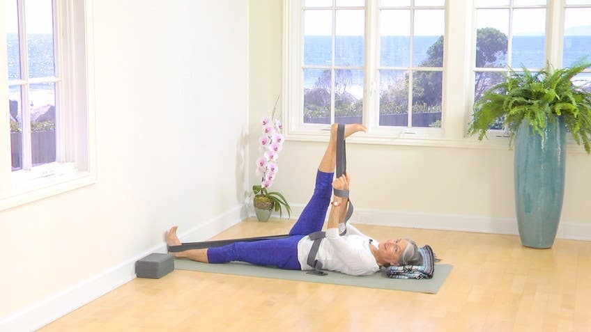 And then take a breath or two here, something starts to release, so then it's time, it's time to take your leg up. So this is the traditional way of holding the foot, you're really hooking your first, second, index finger and third finger over and the thumb and like that. But it's not necessary to be that flexible to get the benefit from the pose, in fact, flexibility is often overrated. I'm going to put the belt around the toes, hook my arms in, let the leg stretch and let this lower leg do its work. Lower back is getting stretched, hip is getting stretched, leg is stretching.