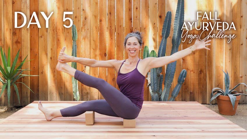 Hello, everyone, welcome back to day five of our fall Ayurveda yoga challenge here. I hope you're feeling nourished and in good spirits from our yoga this week and from your extra self-care practices got one more practice to share with you today and what we'll need for class is a blanket and a couple blocks and a bolster, but we're going to begin on the ground with perhaps no props at all. And if you can turn towards the floor when you're ready, going to lie down on your belly. If you like more padding, you can, of course, open up your blankets and have more padding underneath you. And we'll start in this prone position with your hands potentially stacked.