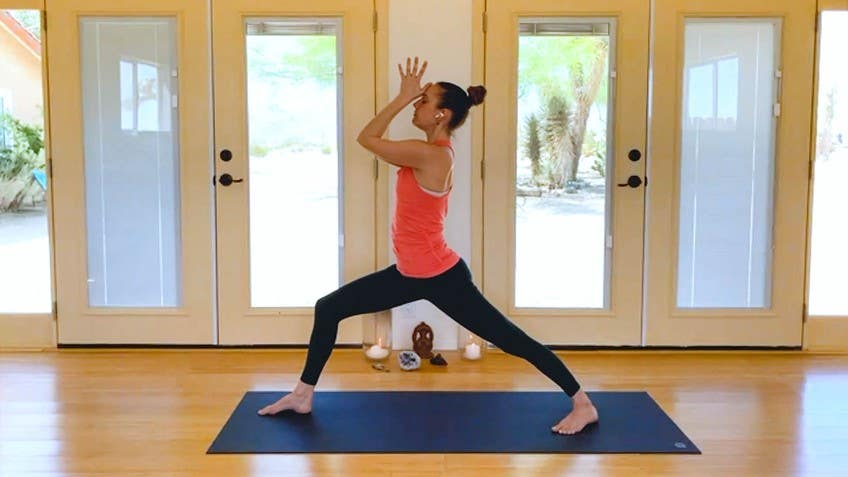 Welcome everyone. Thank you so much for joining us from wherever you are in the world. I saw a few people on the chat before I came over to my mat so thank you for saying hi and hope you're having a good Monday so far wherever you are. So we're gonna get into the sixth chakra today in our practice together so if you've been with us during this whole series we've kind of been working our way up from the ground up so I can't believe we're already at number six which is the third eye which is the Ajna chakra and it's all about intuition the inner knowing the inner teacher and just kind of tuning into that inner voice that we all have sometimes we just have to get quiet enough to hear it and the element we've kind of been working with these elements of the chakras the element of the sixth chakra is light so we'll illuminate and call in that quality of light to see clearly and we will do this by starting in child's pose so if you'll join me in child's pose on your mat when you're ready and just take your time and I love starting in this pose because it's the pose of the beginner so we'll bring the big toes and heels together you might choose to have your knees together or they might go wide just depending on what feels better in your body and you just start to walk your hands in front of you and you can let the third eye either rest on the earth or you might stack your hands and let your third eye rest on top of your hands just let it rest on something if you have a block it might rest on a block and then just start to rock your head from side to side so you're feeling into that space between the eyebrows where the yogis say this is the seat of our intuition and then take a very big full breath in through your nose filling up and then open the mouth inside out let something go try that again just a cleansing breath as we begin here inhaling through the nose and then opening the mouth side out let it go one more like that big full breath in deep sigh let something go beautiful and then as you're here you might come into ujjayi breath allowing the breath to start to move in and out slowly through the nose and checking in with an intention for your practice today anything at all that you'd like to call in and maybe it's that whisper of the inner voice that's allowing you to tune in to what your intention might be as we begin our practice and then using that taking it with you as we start to move into our intuitive flow so reaching your arms forward if they're not already there and you can start to tent your fingertips so the elbows start to lift up off the earth and then walk your hands over to the right side so you're taking a nice side body stretch letting a little weight shift off towards your left hip and then just allowing the breath to travel through the left side body all the way up through the left rib cage just kind of notice how that feels beautiful and then taking your hands back through center and we'll just take it up and over to the other side so walking the fingertips over to the left side let a little weight shift off towards your right hip reading into the right side body all the way up through the right rib cage nice and then just coming back through center just roll up for a moment to sit back on your heels I'm just gonna face you as we sit on our heels and take eagle arms so bring the right arm under your left start to draw the elbows up away from you you might lift your gaze a little bit allowing a big full breath in here just feel the opening through the back body good and then as you exhale start to draw the elbows in toward the navel round through the spine so there's like this cat pose in the body let that chin drop down towards your chest and again just feel the opening through the back ribs nice and then as you come up out of there bring your hands behind you you can tent your fingertips behind you and just start to lift up through the sternum maybe lift your gaze and you might even lift the hips up a little bit if that feels okay beautiful and then release that down and we'll just take it to the other side so this time just let the left arm come under the right wrap it up so you can bring the backs of the hands together or the palms together on an inhale draw the elbows up and away from you lift the sternum lift your gaze feel the opening good and then as you exhale find that rounding cat-like energy draw the elbows in let the chin tuck down towards your chest beautiful and then as you come out of there again we'll just bring the hands back behind you fingertips to the earth just feel a lift maybe the hips lift maybe that feels like too much right now good and then let that go and meet me in all fours we'll come to a tabletop position and then as you come to your tabletop we'll start by lining up with the shoulders over the wrists and the hips over the knees and then just start to move in a way that it feels nice to start to wake up the body so intuitively what does the body need to begin to wake up so maybe it's cat-cow maybe it's some circles with the spine for barrel rolls maybe you're stretching out your wrists for a few breaths kind of tuning in to what you need and maybe the eyes are closed as you start to breathe into whatever movement is asking for you to move right now it's calling you intuitively taking a few more breaths wherever you are beautiful and then meet me back in a tabletop position as you're ready and we'll walk the hands just slightly in front of the shoulders coming up into our first down dog tucking the toes lifting the hips up and back beautiful and as you come to your first down dog start to move around again this what do you need here what's the body asking for maybe pedal it out through the feet maybe swaying your hips side to side or shaking your head yes and no a few times and you're pressing evenly through all ten fingers so pressing through the inner hand as well as the outer hand let your heels get nice and heavy your sitting bones rea