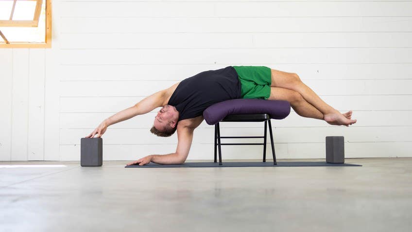 Maybe start to reach the arm back behind you. Push your thighs into the edge of the seat. Perhaps we can start to feel a little more up, and then we can lean back. Maybe the right hand can graze the right heel for a little half camel. Keep moving your thighs into the edge of the seat.