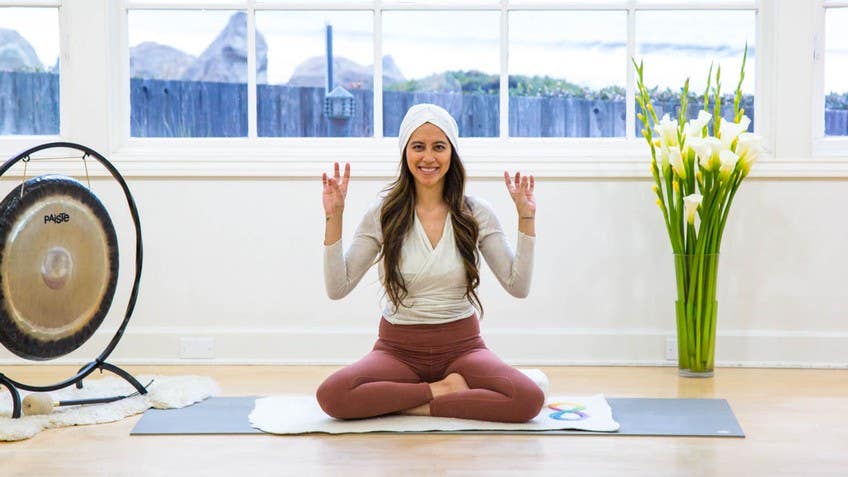 Clear. Peace. No stress. Exhale. Gently, slowly open your eyes. And so now we'll begin the set. So this first Asana, our hands are in a very specific hand position. And so it's called a mudra. So your palms are facing outwards towards me. Your elbows are bent, just like how mine are. And you're going to be switching your thumb to touch your pointer finger, calling upon that Jupiter energy of knowledge and wisdom. And then your ring finger, also known as the sun finger. So positivity, prosperity, health. And so you're switching from thumb to your pointer finger and then to your ring finger. And so it's supposed to be what it's calling for is that in one second, you're able to switch back and forth nine times. But if not, it can be three times. So any time between anything between three to nine touches in a second works. So you could be going really fast or just a little bit slower per second. And so this is the mudra. So find yourself here in a comfortable seated position. If you need to put a bolster underneath your buttocks or a blanket, a pillow, that works as well. If you've been seated in the same easy pose position this whole time, switch your legs, whichever is in front, bring to the back, elbows bent, and you're breathing long and deeply, eyes closed, focused at your third eye point. And let's begin. So we're calling in knowledge and wisdom to overcome stresses, positivity, health, even through the stresses. And we turn those stresses into prosperous possibilities. Taking notes of what stresses are arising and what seems to be such a simple asana, such a simple exercise. You're just moving your fingers, but suddenly you start to feel the tension in your wrists, in your hands, in your arms. And instead of reacting to this, instead of thinking, why is this becoming difficult for me? Instead, can you just focus on your breath? Can you use your breath to throw off that tension, that stress, and find within you a strength? You find within you a peace? That is the practice. That's why we're here.