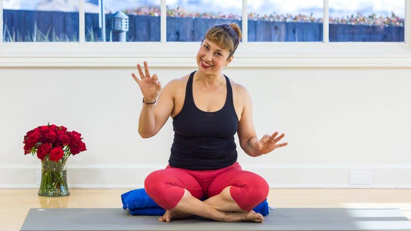 I like to take my hands and take them into Janamudra, so the index finger comes to the first knuckle of the thumb, palms can be upright on top of the thighs, the index finger represents the ego and the thumb represents cosmic consciousness, the whole. So just the ego is bowing to cosmic consciousness and you can place the hands upright on the thighs. And then one other thing that I want to mention, you know, we always see those ancient pictures of all the great yogis and buddhas sitting with the hands resting on the inner thighs, and there's actually a reason for that. The nadis that I was mentioning, there is a nadi, it's called the gupta, and it runs from the inner arch of the foot all the way up through the inseam of the thigh and into the base of the pelvis. So the idea is that when we place our hands right there, we're pressing into the gupta and stimulating that energy to start rising from the soles of the feet and up into the base of the spine, and then we just keep carrying it up, up, up with all of these practices.