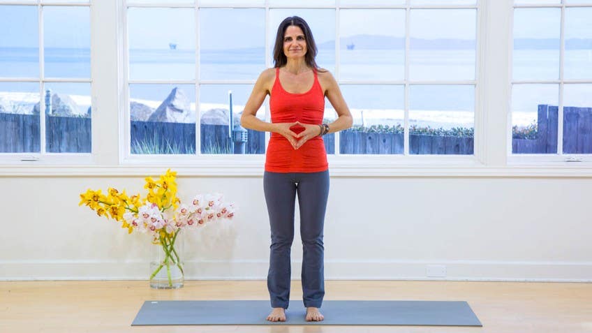 This practice is here for you. When you feel gripped, your breath is short and you're a little anxious. Take your fingers, press them together so the collarbones broaden. Imagine nostrils on your chest center. As your breath comes in through the heart, let it soften your whole chest. As your breath leaves back out through the heart, feel your feet spread on the ground. Breath comes in and softens your chest. Exhale, let it carry tension out as your body lands on the earth. Inhale through the nostrils on the heart, chest expands. Exhale, all your weight to the ground. Hands to heart, may your heart feel soft and your breath feel wide.