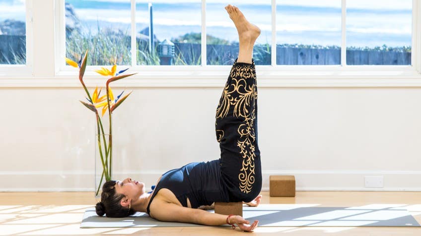 Just allow yourself to be breathed. And then we're going to slide the blanket off to the side, and we're coming into a restorative shoulder stand. So for this, no blanket, but you can use one of your blocks. And if you don't have a block, you might just slide over to a wall and put your legs up the wall. That could be nice, too.